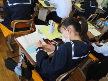 1Bは石川舞華先生の国語です。擬音語(ワンワン、ニャーニャー)と擬態語(バタバタ、トントン)について学習しました。教科書の本文にいくつあるかを探していきます。