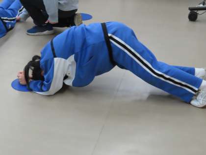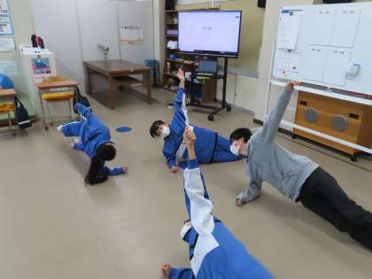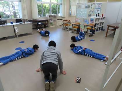 1時間目生単の授業です。体力作りをしていました。体幹トレーニングです。中学生らしい体力をつけていきましょう。