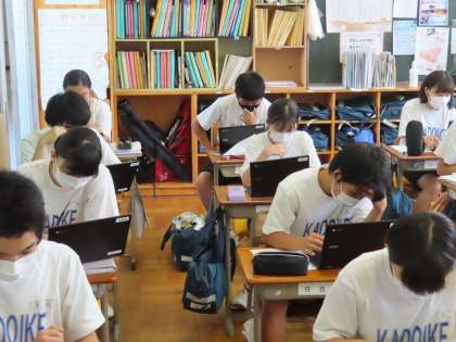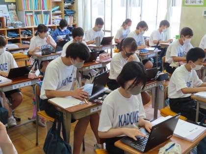 勝俣先生の道徳です。Chromebookを使いジャムボードで意見を集約していきます。学級の中で私にしかできないこと・・・どんなことがあるのか・・・を考え意見として出しています。