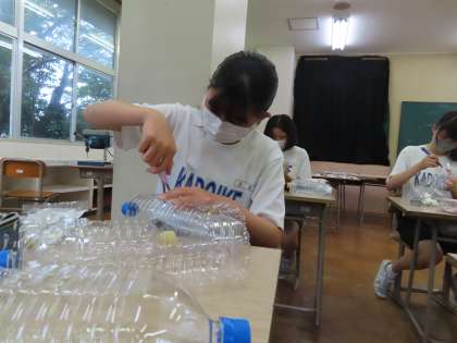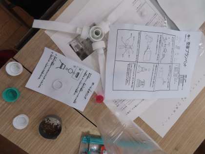 ペットボトルを使って(空宙プランペット)かいわれ大根(スプラウト)の栽培をします。工作のようにペットボトルを加工していました。