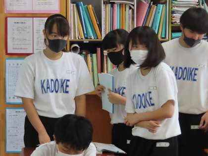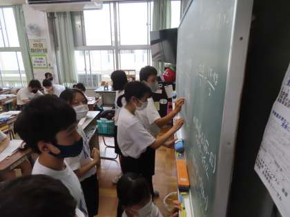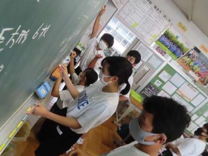 黒板の問題にトライしていきます。ペア学習で答えを相談しながら解決していく方法です。できたペアが黒板に答えを書きに行きます。
