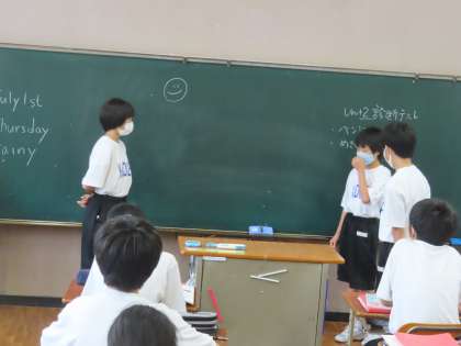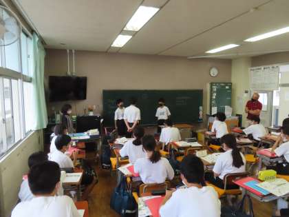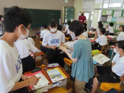 写真ではわかりにくいですが、アイコンタクトやジェスチャーをつけて会話している生徒もいます。トライした生徒たちにはシールが山開さんから渡されます。