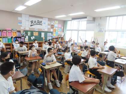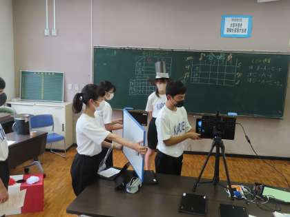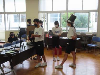 渓流会関係の生徒集会を行いました。生徒会室からChromebookを使い、meetで配信して行いました。学級の大型モニターに写し開催しました。生徒会メンバーが生徒会室をスタジオのように使っています。