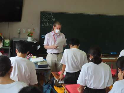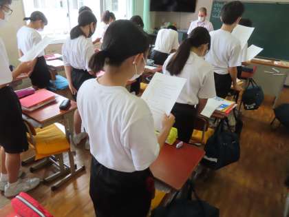 1Aは英語です。ALTのマークと山開さんが授業に入ってくださいました。「Let it be」を歌っていました。生徒ははじめて聞く曲だと言っていました。すこしショックでした。ビートルズを知らない世代になったんだ、と感じてしまいました。