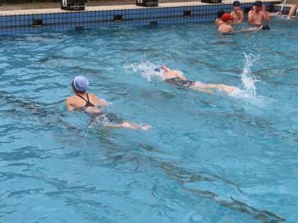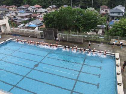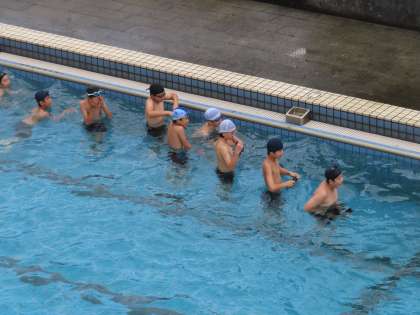 今日は水泳の授業です。体操をしたあと、シャワーを浴びてプールサイドに座ってバタ足です。だんだん水に慣れていきます。