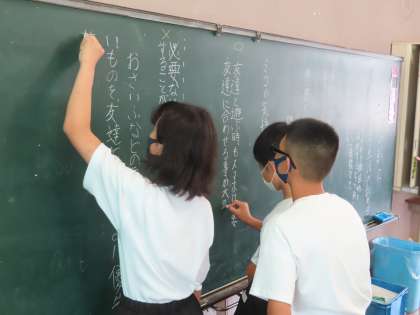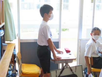 1Bの道徳は栗田先生です。「日曜の朝に」節度節制の内容です。友達と休みの日、出かけることになった。待ち合わせ場所に間に合わない・・・どこにでもありそうな出来事ですが自分ならどのような行動をとるのかを考えていきます。