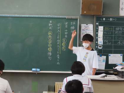 くり返し言葉が入っている、これを反復法orくり返し法という。「青い山」で終わっているのは、名詞止めor体言止めといいます。隣同士での意見交換が考えを膨らめます。