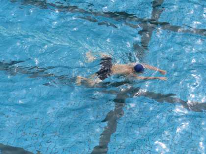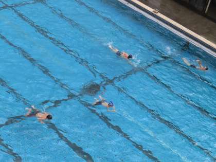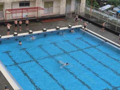 水泳の授業です。はじめは少し雨が降っていましたが、だんだん薄日も差してきました。