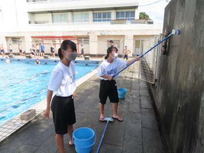 先週から少しずつ蝉の鳴き声が聞こえはじめました。雨がやみ本格的に「太陽」が顔を見せるようになって、「蝉の鳴き声」も本番を迎えています。見学者のプール掃除です。