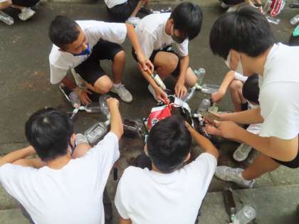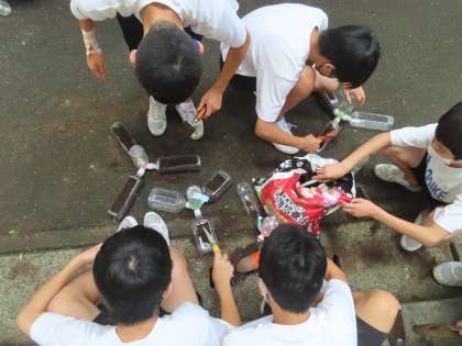 先日まで水耕栽培をしていましたが、今回は葉物野菜の栽培です。栄養たっぷりの土をペットボトルに入れていました。
