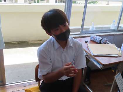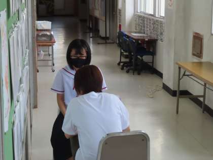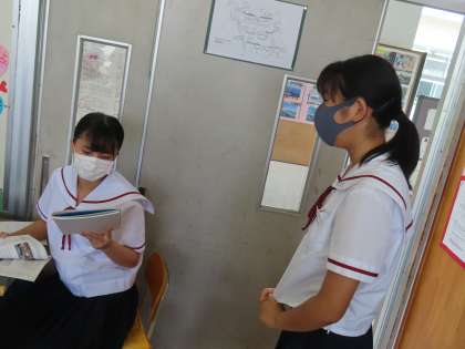 こちらの生徒たちはこれからテストを受ける順番待ちです。なめらかにはっきり話しましょう。がんばれ!