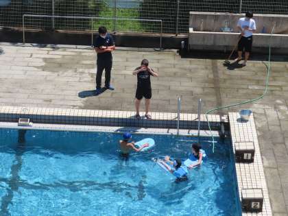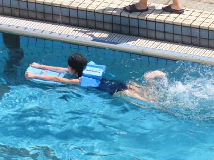 I組の体育は水泳です。今日はとても暑くてちょうどよい天気となりました。「バタ足の練習と腕の動かし方に取り組んでいます。