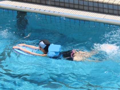 ビート板を使い、バタあしで少しずつ前に進んでいきます。体を浮かせることも、水につかることも平気です。