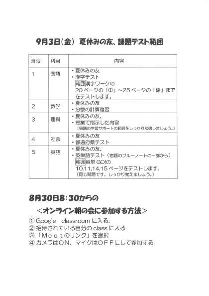 その2 9月3日(金曜日)予定の課題テストの内容変更について