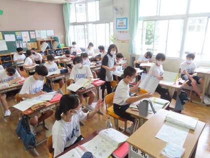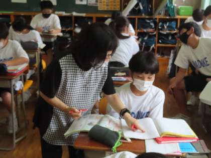 英語では教科書の問題を各自で取り組んでいました。山開さんと藤村先生で順番に巡視しながら助言していきました。