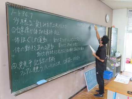 体育理論の授業を行っていました。スポーツの「多様な楽しみ方や工夫のしかた」を健康、記録、自然との共生などの観点から考えます。