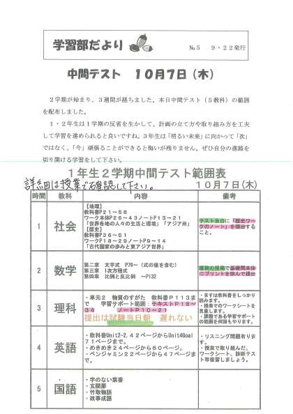 10/7(木)に行われる中間テストの範囲が配布されました。