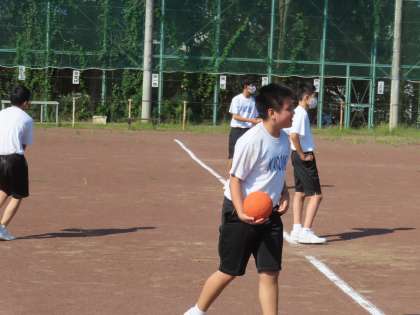 2Aはハンドボール投げを行っていました。ここまでに走ったり、筋トレをしたのですが、結構ばてています。前回の体育で筋肉痛になった生徒もいます。