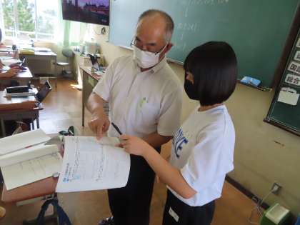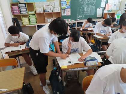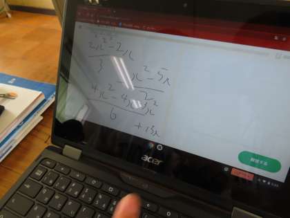 教室内で先生方を入れて、教え合い学習が進んでいました。全ての課題が終わった生徒はネット上の問題集「キュビナ」に挑戦しています。