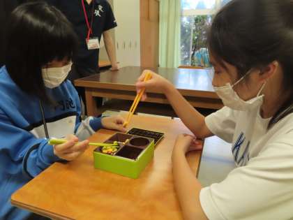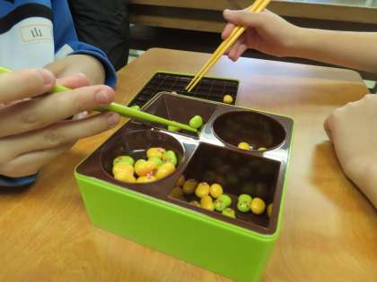 豆つかみゲーム?の様子を見せてもらいました。色んな形をしている「お豆」を橋で掴み指定容器に入れていきます。なかなか掴みにくい。今日は水輝さんが勝ちました。