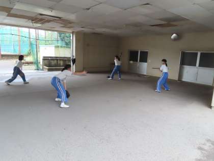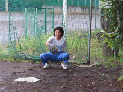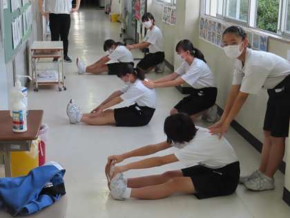 台風のためにグランドでの活動ができませんが、場所を工夫して活動しています。