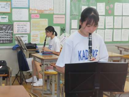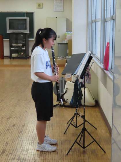 吹奏楽部はばらばらに分かれて練習しています。教室には数名しかいません。