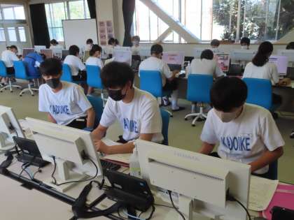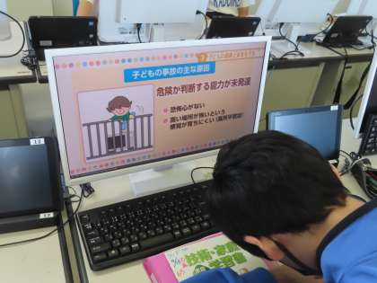 保育の内容です。個人で映像を見ながら必要事項を書き出しています。子どもの健康と安全を考える。子育ては母親だけの仕事?認定こども園ってなに?などの問いがあります。