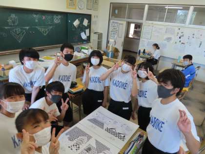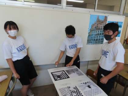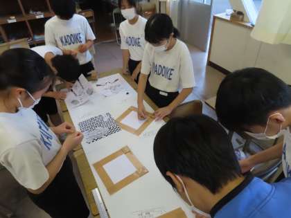 修学旅行の表紙絵として取り組んだ、作品の展示準備をしています。廊下に展示するために台紙に貼りつけていました。