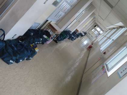背面黒板のロッカーの上に提出物がおいてありました。まだ、朝の段階でしたので冊数は多くなかったですが、しっかり忘れずに出してください。廊下も整然とカバンが置かれています。