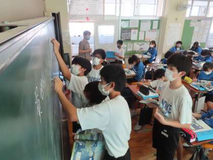 1Aは社会です。ちょうど作業マップという問題を行っていました。資料集の問題です。できた生徒から矢後先生に見せに行き、正解した場所の答えを黒板に記入します。OKの生徒はシールをもらえるため頑張っていました。