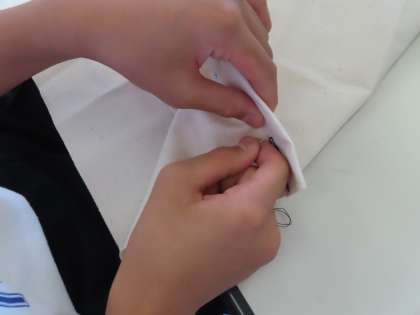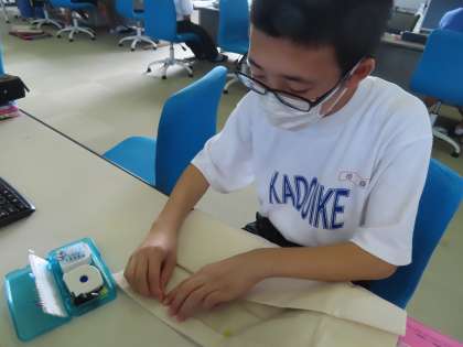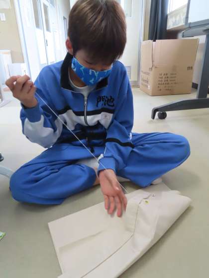 パソコン室で家庭科の授業です。トートバックを作製中です。縫い目が一直線のはずが、少し曲がってしまっています。根気強く取り組んでいる姿が素晴らしかったです。