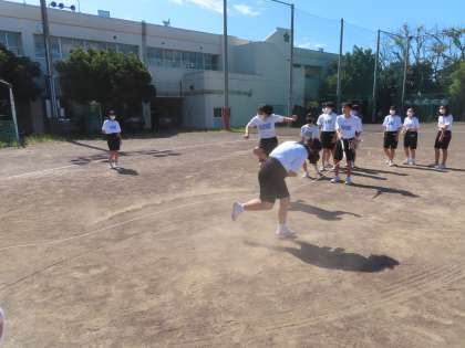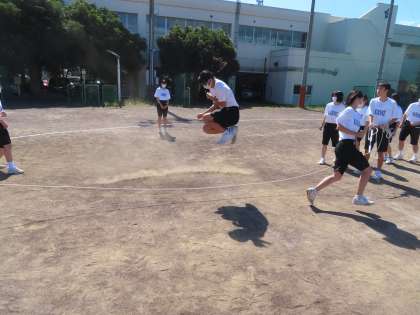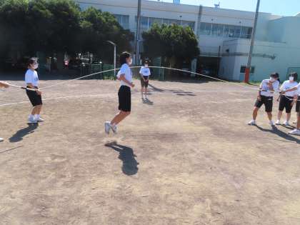 長縄の練習の前、全員で交差飛び?をやっていました。タイミングとリズムが大切です。連続何回跳べるでしょうか?