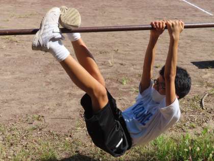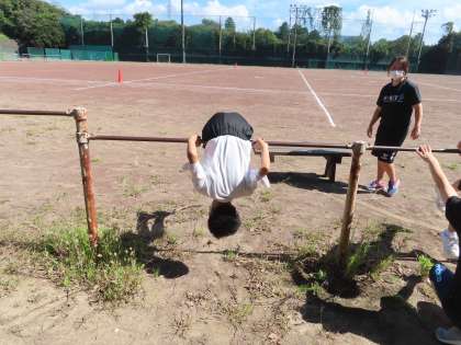 鉄棒を行っていました。鉄棒に「飛び乗り」をします。体を前に倒してくるっと回って降ります。鉄棒横ぶる下がりなどをやっていました。