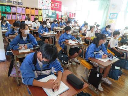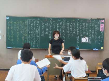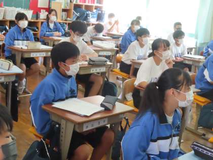 1年生の道徳は「笑顔について考えよう」です。人は色んな場面で複雑な気持ちを込めて「笑顔」になります。そんな笑顔について考えます。文は、いじめを受けている生徒の気持ち、いじめている側の気持ちで考えを深めています。どんな笑顔がいい?と近藤先生が質問です。楽しい笑顔がいいと答えが来ました。