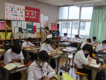 舞華先生の国語です。「複数の情報を関連づけて考えをまとめる」について学習しています。内容をしっかり理解するための方法を考えていました。石川先生は、教科書を読む際、机間巡視しながら本を読んでくれます。