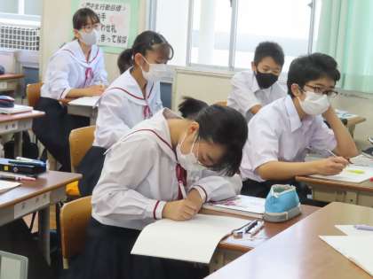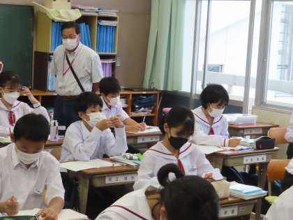 吉田先生の数学です。「反比例のグラフを書こう」という課題です。表を読み取りグラフに写します。メモリを間違わないように注意をしていました。後ろに小島先生がいてくださっています。