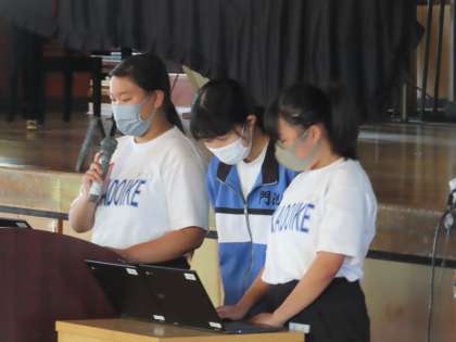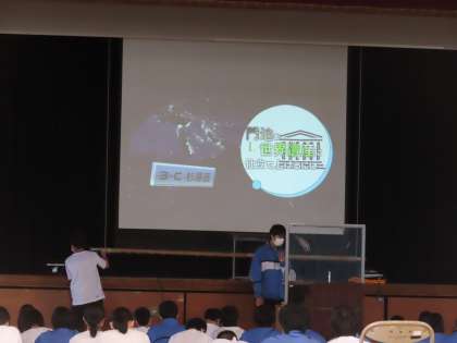 3時間目に総合学習の学年発表会を行いました。杉原さんの「門池を世界遺産に・・・」新田・平井・佐々木さん達の「門池に観光スポットをつくろう」から発表が始まりました。