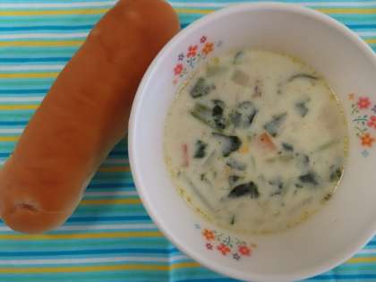 リンゴチップがたくさん入ったロールパンでした。クラムチャウダーもクリーミーでおいしかったです。ごちそうさまでした。