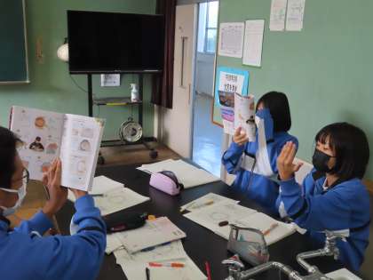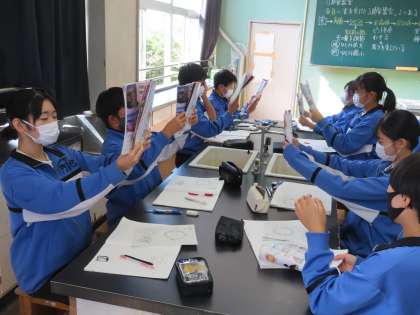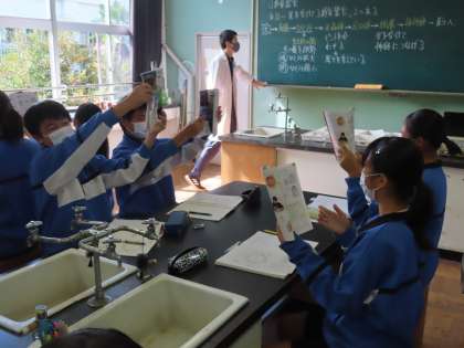 理科室で「目と耳の刺激の受けとり方を覚えよう」という内容で授業をしています。感覚器官としての「目」を取り上げています。教科書にある・と+を使って実験をしていました。生徒からは「なぜー」と声がが上がっていました。教科書を近づけると、ある地点で点が見えなくなってしまいます。