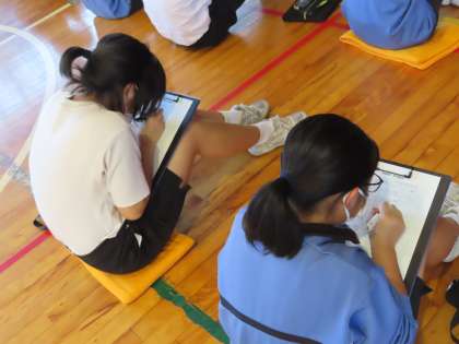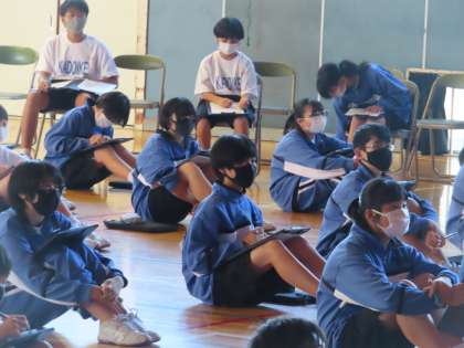 テーマはそれぞれで、「沼津市の高齢化について」「門池の歴史」「門池中の歴史大解剖」などがありました。発表を見ての感想を記入しています。