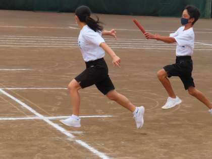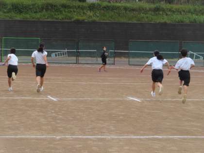 1Cはグランドバトンパスの練習をしています、奇数から偶数へ、偶数から奇数へ入念なバトンパス練習が行われました。バトンの持ち方や全力疾走を要求しています。