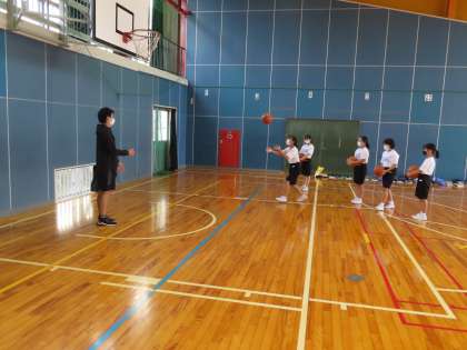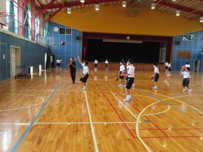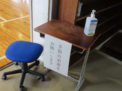 男子も女子もぎこちなくステップを踏む生徒が多くいます。早くなれましょう。入り口には消毒用のあるこるが常備してあり安心です。
