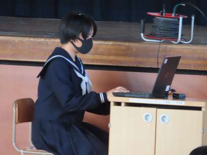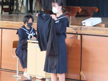 防寒着の着用の仕方や色など実物で説明もします。生活委員会の3年生だけで運営しています。さすが3年生です。