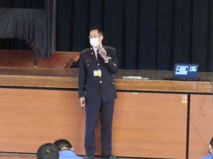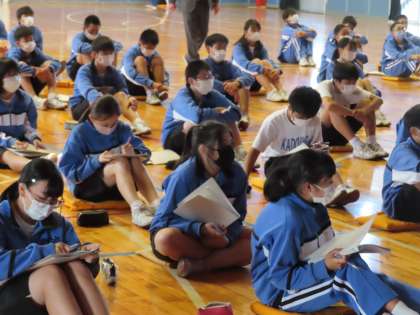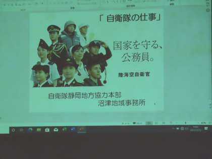 最後は自衛隊静岡地方協力本部沼津事務所から梅野広報官が自衛隊につての概要について説明していただきました。自衛隊の中にはたくさんの仕事があり充実していること、そして何より一番の仕事は「国民を守る公務員」だと教えてくれました。