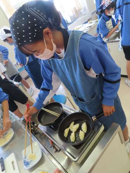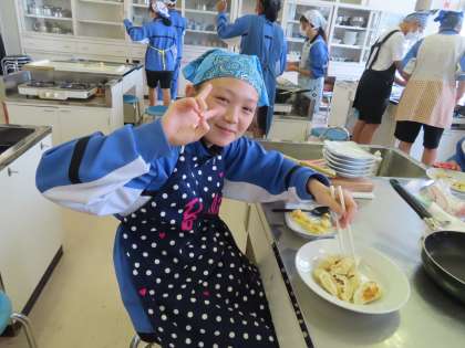 2Cはリンゴの皮むきと調理のテストをしています。おいしそうな匂いが、学校中に広がっています。