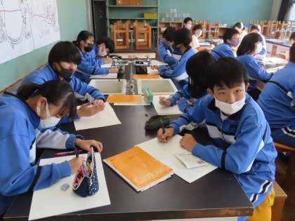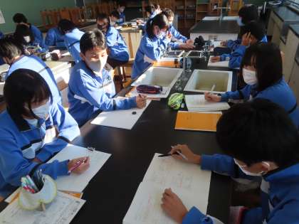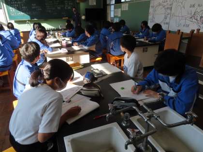 「5つの水溶液を見分けよう」の授業です。班で考えた方法をたくさん出しながら、見分け方を考えていきます。水・食塩水・エタノール・塩酸・水酸化ナトリウム水溶液の5種類です。どんな方法で見分けるのでしょうか?