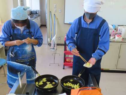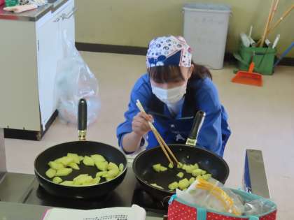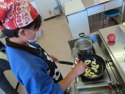 皮を剥いたリンゴの調理では、アップルパイとジャムのどちらかを作るそうです。おいしそうな匂いが広がってきました。自分で作るため焦げてしまっても自分が食べることになります。じーーとフライパンを見つめていました。