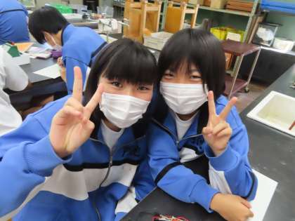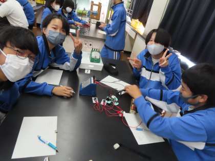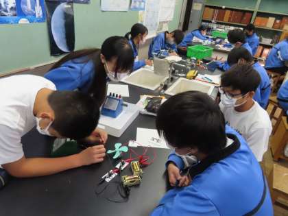 種本先生の理科の授業です。生徒たちは回路を組み立てながら電圧や羽根が回るか?豆電球がつくか?を確認していました。「あれっ?」「つかない?」などのつぶやくも聞こえてきます。終了した班は余裕ですね。