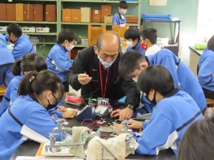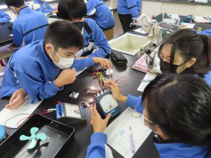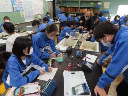 班内で意見を出し合いながら最終的には全ての班が目的を果たしました。今日は「並列回路と電圧」…並列回路における電圧の規則性をみいだすが今日の授業の内容です。