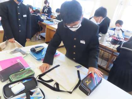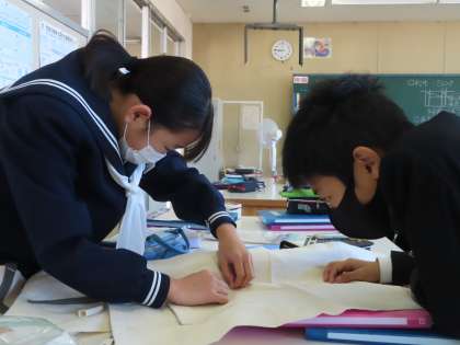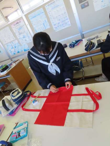 すっかりできあがりそうな生徒や、まだ縫いはじめたばかりの生徒もいます。縫い目がまっぐできていない生徒生徒もいます。最後まで頑張れ!